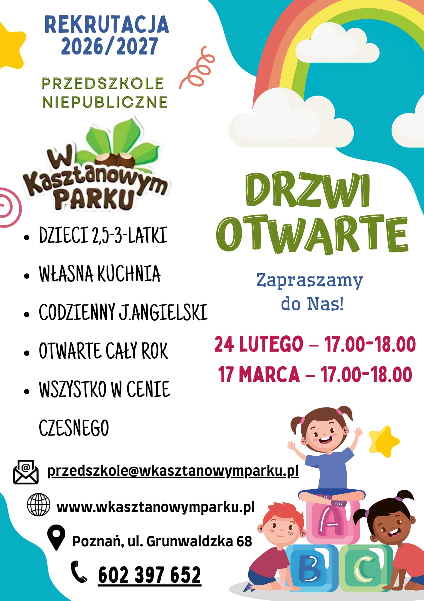 Witamy w Przedszkolu w Kasztanowym Parku – miejscu, gdzie dzieci rozwijają się w atmosferze ciepła, radości i bezpieczeństwa. Nasza placówka oferuje wyjątkową przestrzeń do nauki i zabawy, otoczoną pięknem natury i bliskością parku. Stawiamy na wszechstronny rozwój maluchów, wspierając ich ciekawość świata, kreatywność i umiejętności społeczne.